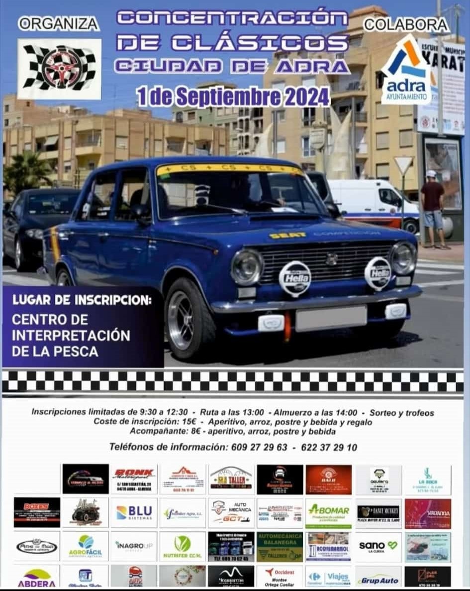 La ciudad de Adra acoge este domingo, 1 de septiembre, la tradicional Concentración de Clásicos ‘Ciudad de Adra’. Un esperado encuentro en la ciudad milenaria que contará con los mejores coches clásicos y una convivencia en esta jornada de final de verano. Las inscripciones son limitadas y comenzarán a las 9:30 horas en el Centro de Interpretación de la Pesca. Posteriormente, a las 13:00 horas, tendrá lugar la ruta de los vehículos y, como broche de oro, una hora más tarde, el almuerzo, sorteo y trofeos. El coste de inscripción para este evento con el que colabora el Ayuntamiento de Adra es de 15 euros. Además se puede acudir con acompañante por tan solo 8 euros.