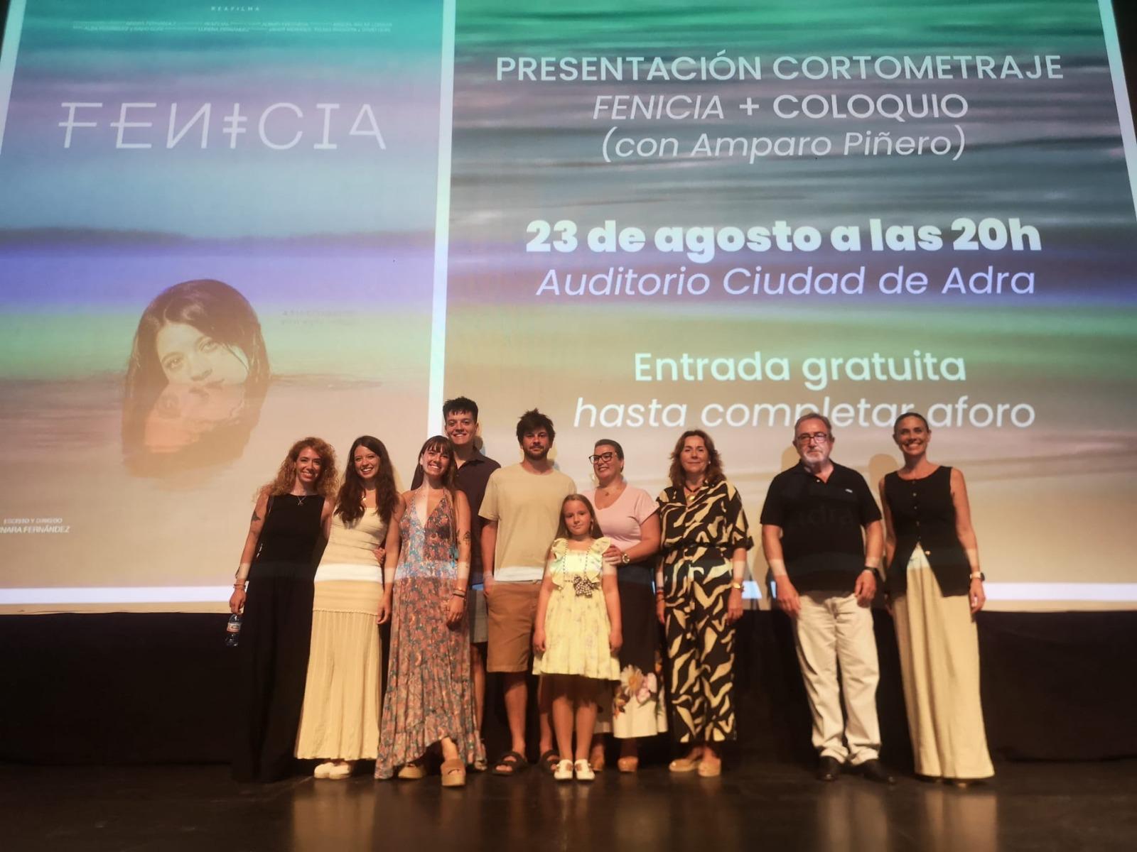 El Auditorio ‘Ciudad de Adra’ acogió, el pasado sábado, la presentación del cortometraje ‘Fenicia’, dirigido por la abderitana Ainara Fernández y producido por Reafilma S.L. La convocatoria del evento atrajo a un más que notable y entusiasta público que posteriormente pudo disfrutar de un coloquio con la directora y guionista, Ainara Fernández; la productora, Lorena Fernández; la actriz principal, Amparo Piñero; y los actores, Antonio Carmona, Ángeles Enrique y Martina Martín. Todos ellos estuvieron acompañados de las ediles de Cultura y Presidencia, Elisa Fernández y María Paz Fernández, que pusieron de manifiesto que productos como ‘Fenicia’ son “un excelente escaparate para nuestra ciudad”.