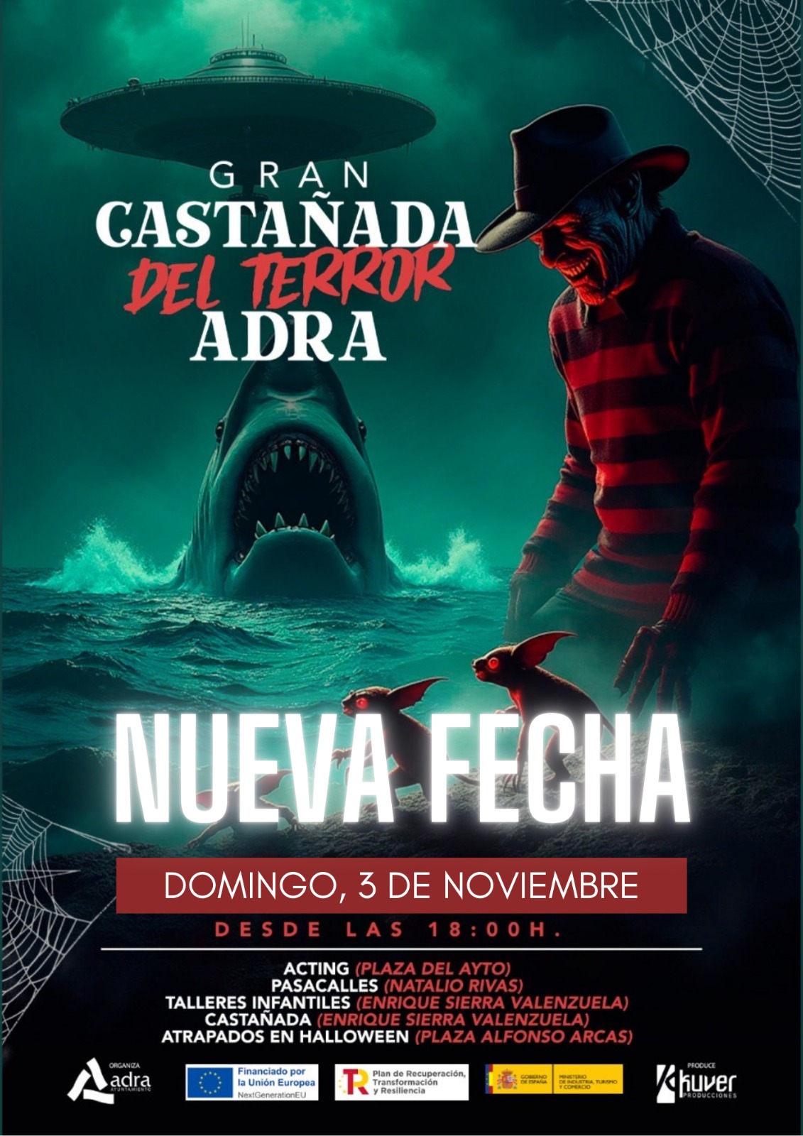 Esta programación, organizada junto a Kuver Producciones, tendrá lugar el domingo, 3 de noviembre, a las 18:00 horas y se extenderá a lo largo de la tarde con diferentes puntos y actividades. En la Plaza Puerta del Mar (Plaza del Ayuntamiento) abderitanos, abderitanas y visitantes que vengan a Adra serán partícipes de un acting que no dejará indiferente a nadie. En la arteria principal de la ciudad, Natalio Rivas, tendrá como protagonista un Pasacalles. Los talleres infantiles para los más pequeños y pequeñas estará ubicados en la Plaza Enrique Sierra Valenzuela y, en la misma ubicación, la Gran Castañada del Terror. Además, en la Plaza Alfonso Arcas, ‘Atrapados en Halloween’ hará que la jornada sea completa.