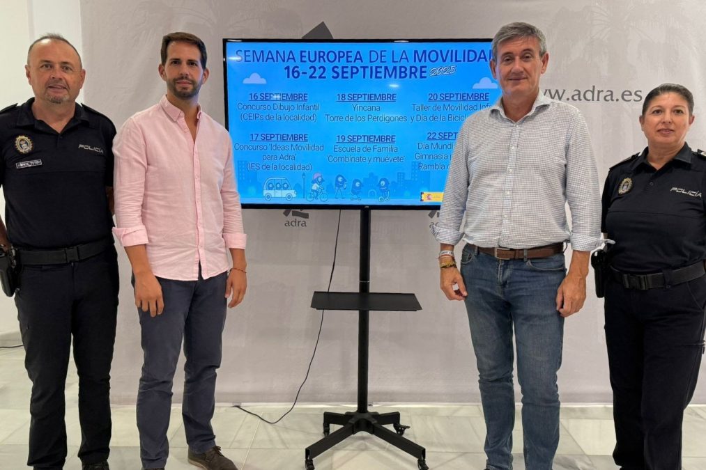 El alcalde de Adra, Manuel Cortés, junto al concejal de Seguridad y Movilidad, José Crespo, ha presentado esta mañana el programa de actividades que se celebrará con motivo de la Semana Europea de la Movilidad 2025, que tendrá lugar en la ciudad del 16 al 22 de septiembre. En la presentación también han estado presentes la Inspectora Jefa de la Policía Local de Adra, María Trinidad Pérez; y el Agente Tutor del cuerpo, José Antonio Vargas.