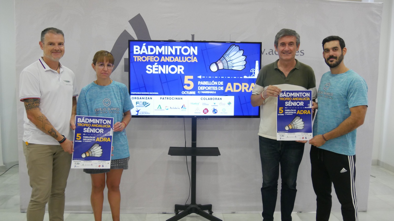 El próximo sábado, 5 de octubre, la ciudad de Adra será testigo del deporte de gran nivel con la celebración del Trofeo Andalucía Senior de Bádminton, uno de los campeonatos más importantes que pretende reunir a jugadores de Andalucía y del resto de España en el Pabellón de Deportes Municipal. Una jornada que comenzará a las 09:00 horas y que tiene como objetivo “fomentar el bádminton de competición en la ciudad milenaria”. Así lo han dado a conocer este jueves en el Consistorio abderitano el alcalde de Adra, Manuel Cortés; el concejal de Deportes del Ayuntamiento de Adra, Juan Antonio Fernández; y la presidenta y entrenador del Club Bádminton Alborán, Isabel María Avilés y Juan Antonio Fernández.