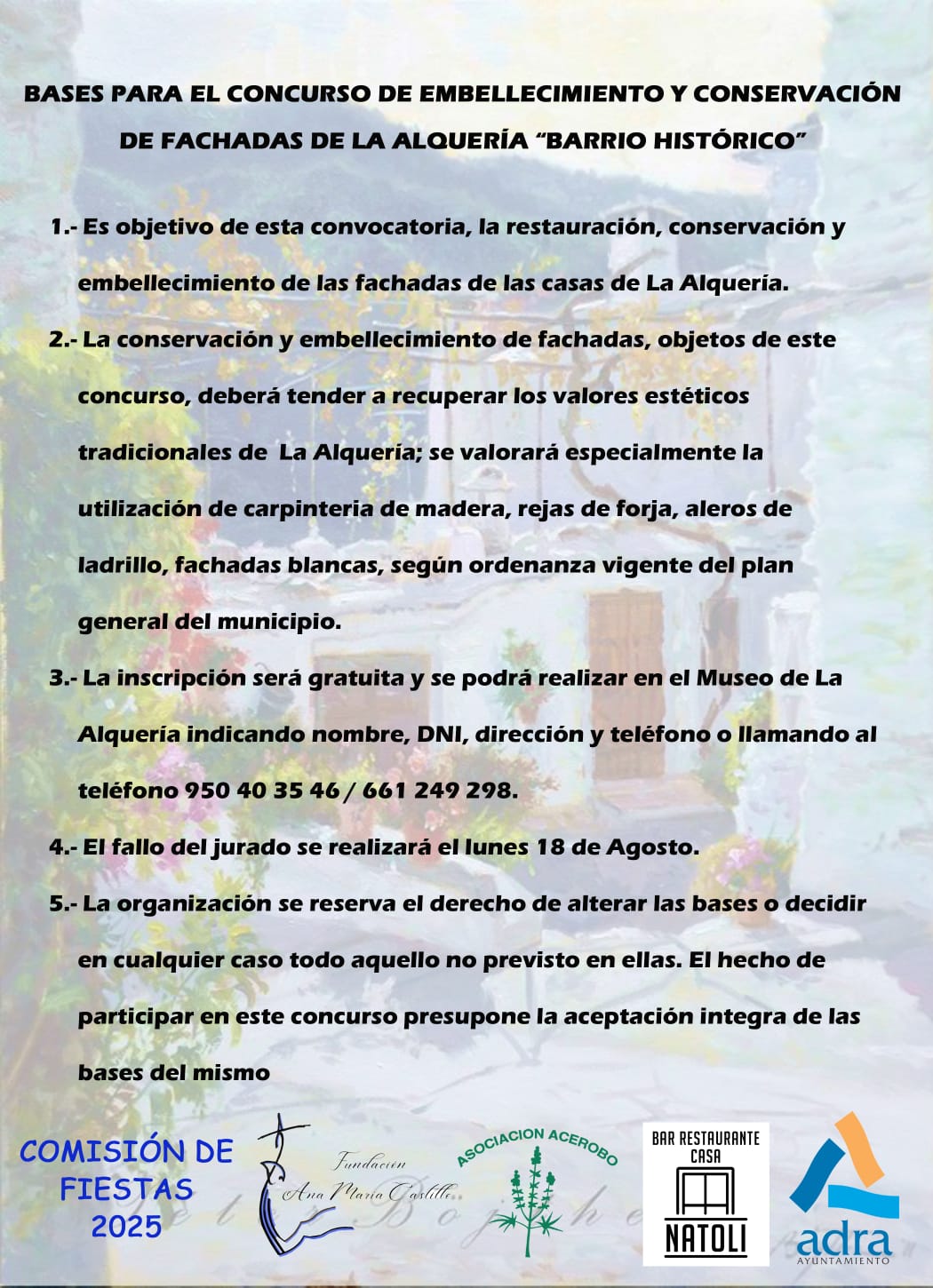 El objetivo del concurso es la restauración, conservación y embellecimiento de las fachadas de las casas de La Alquería, recuperando los “valores estéticos tradicionales” que son seña de identidad. Por ello, el jurado valorará positivamente la utilización de la carpintería de madera, las rejas de forja, los aleros de ladrillo y las fachadas blancas, a la hora de elegir a los ganadores. La inscripción es totalmente gratuita y se puede realizar en el Museo de La Alquería indicando nombre, DNI, dirección y teléfono o llamando al 950 40 35 46 ó 661 249 298.