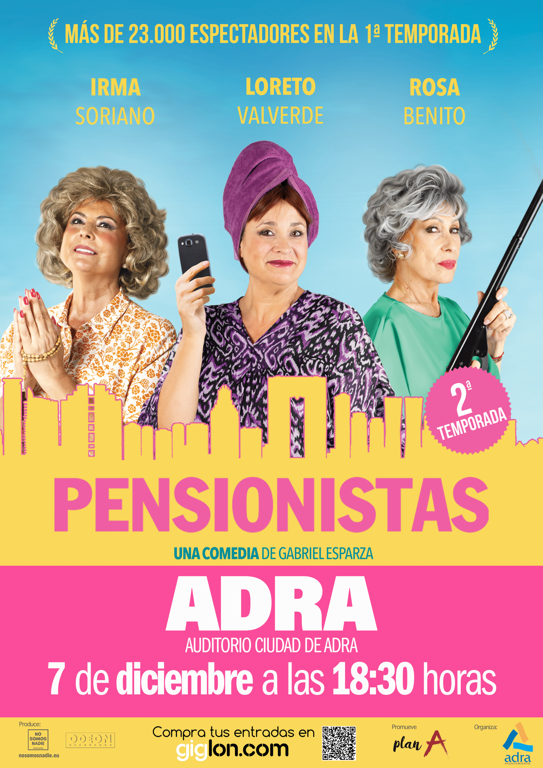 El Ayuntamiento de Adra continúa ofreciendo citas culturales de altura para todos los gustos y edades. Tras anunciar la llegada de las esperadas Guerreras del KPOP el 8 de diciembre, este miércoles se ha informado de otra cita para ese mismo Puente de la Constitución. Se trata de la comedia ‘Pensionistas’ de Gabriel Esparza, protagonizada por las conocidísimas Irma Soriano, Loreto Valverde y Rosa Benito. Las entradas para disfrutar de esta desternillante obra el domingo, 7 de diciembre, a las 18:30 horas, están ya a la venta en taquilla y en www.giglon.com, desde tan solo 18 euros.