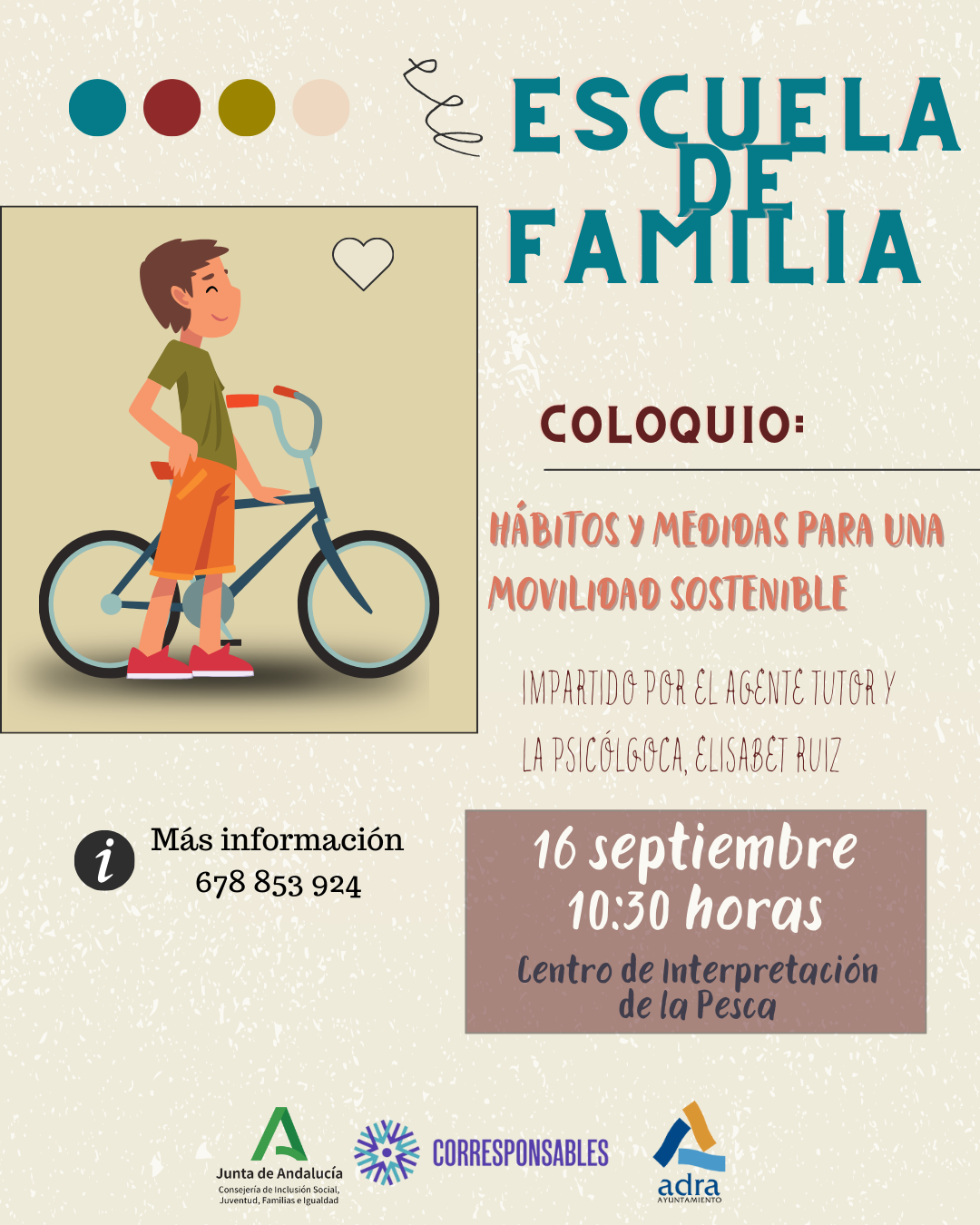 La Escuela de Familia de Adra retoma la programación después del período estival el próximo lunes, 16 de septiembre, con el coloquio ‘Hábitos y medidas para una movilidad sostenible’, en la Semana Europea de la Movilidad que se conmemora desde el 16 al 22 de septiembre. Será en el Centro de Interpretación de la Pesca, de 10:30 a 12:00 horas, de la mano del Agente Tutor y de la psicóloga, Elisabet Ruiz.