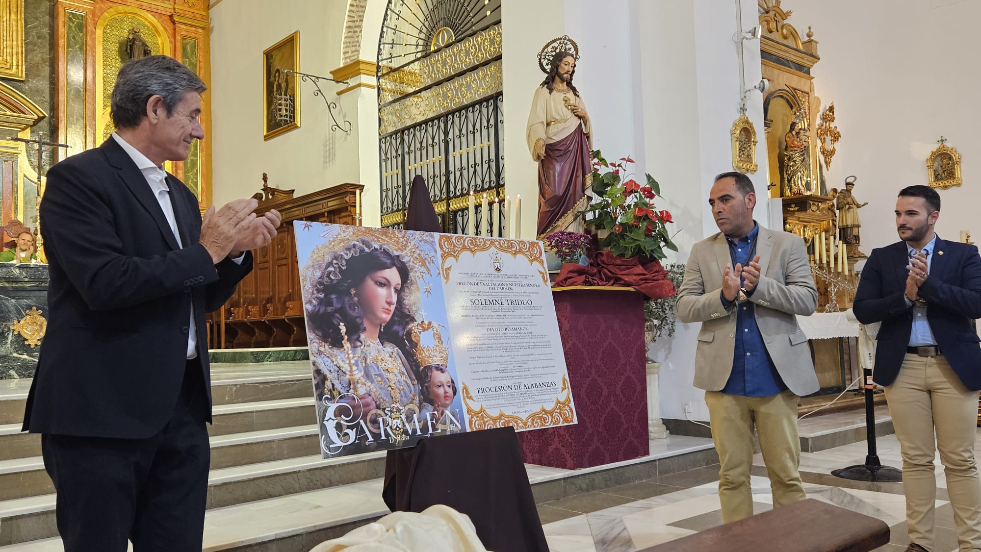 La Hermandad del Carmen de Adra ha presentado este domingo en la Parroquia Inmaculada Concepción el cartel anunciador de los solemnes cultos que se celebrarán en la ciudad milenaria en honor de la Virgen del Carmen, patrona de los marineros, a la que se rinde tributo cada 16 de julio. Durante la presentación han estado presentes el hermano mayor de la hermandad, Francisco Manuel Rincón; el alcalde de Adra, Manuel Cortés; el autor del cartel, Francisco José Hernandez; el párroco de Adra, José María Sánchez; otros miembros de la hermandad y concejales del equipo de Gobierno local.