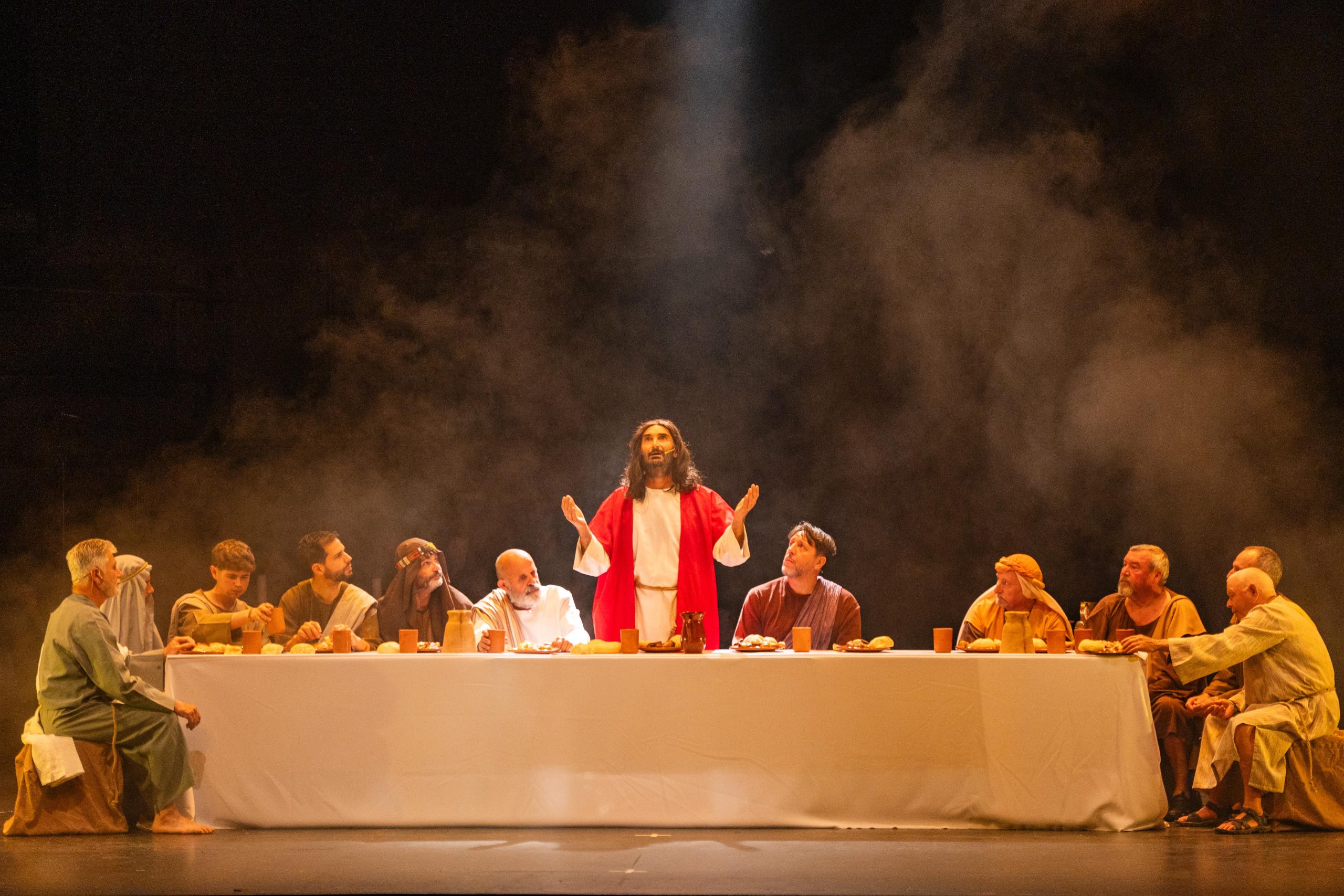 El Auditorio ‘Ciudad de Adra’, abarrotado, ha acogido este sábado la tradicional representación de ‘La Pasión’, una obra de teatro dirigida por Isabel Rodríguez, directora de la Escuela Municipal de Teatro, que ha contado con un elenco de más de un centenar de actores y actrices, vecinos y vecinas de la ciudad, además de las voces angelicales del coro infantil ‘Pedro Mena’. El alcalde, Manuel Cortés, ha dado la enhorabuena “a todas las personas que han participado en esta obra, tanto abderitanos y abderitanas que han hecho las veces de actores y actrices, así como a su directora y a los trabajadores municipales encargados del montaje, luz y sonido, que han hecho el esfuerzo de cambiar la ubicación ante la amenaza de lluvia”. El primer edil, junto a concejales de su equipo de Gobierno, ha disfrutado de esta ineludible y ya consolidada cita, que ha dado el pistoletazo de salida a la Semana Santa de Adra 2025.