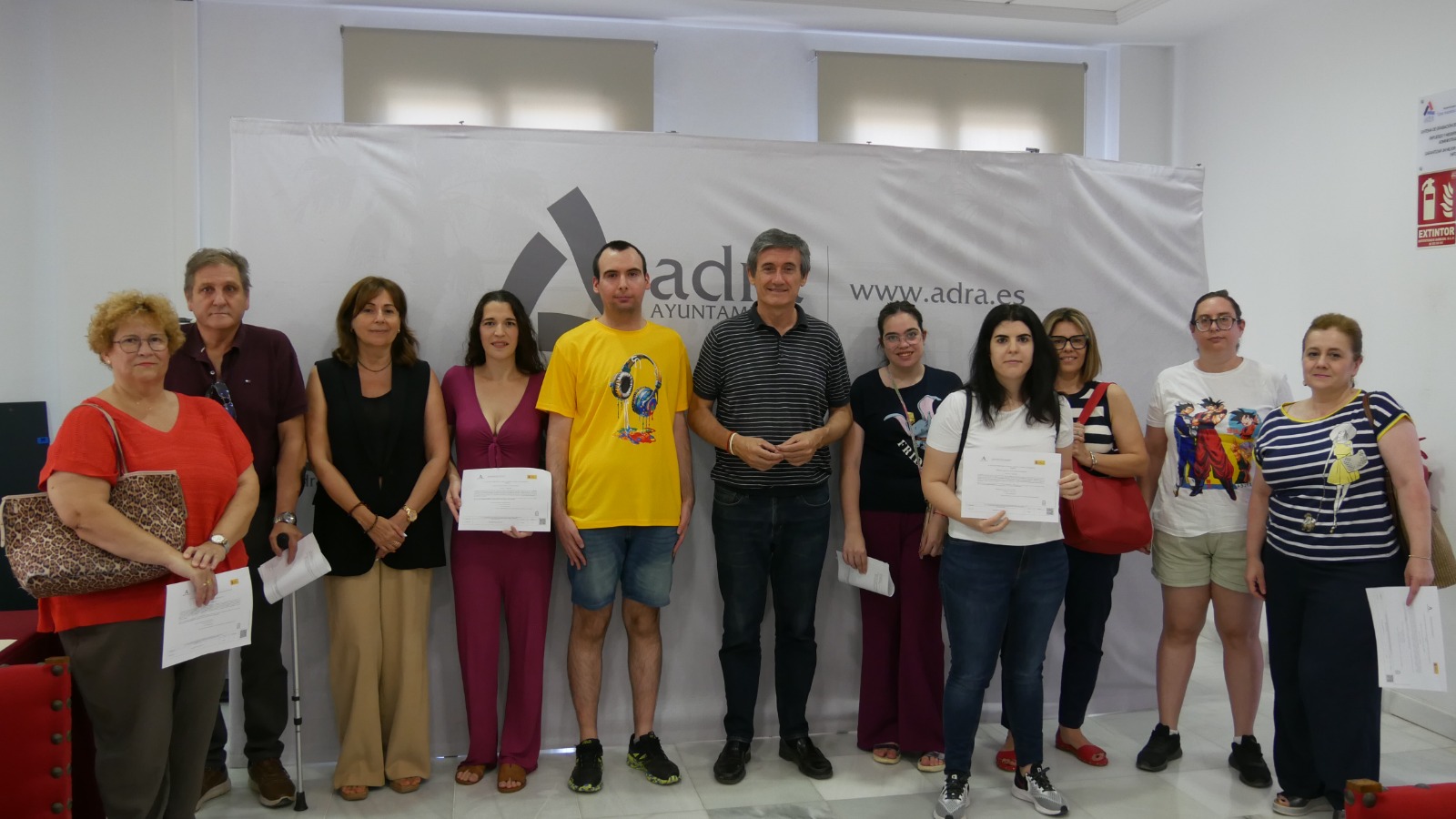 El alcalde de Adra, Manuel Cortés, junto a la concejala de Promoción del Empleo y Formación, María Paz Fernández, ha hecho entrega de los diplomas acreditativos a alumnos y alumnas de los cursos de formación ‘Operaciones Auxiliares de Servicios Administrativos y Generales’ y ‘Atención al Cliente, Consumidor o Usuario’. Dos cursos dirigidos a desempleados y ofrecidos por la Junta de Andalucía en colaboración con el Ayuntamiento de Adra, que recientemente acaban de terminar y que otorgan un certificado de profesionalidad a quienes lo han cursado.