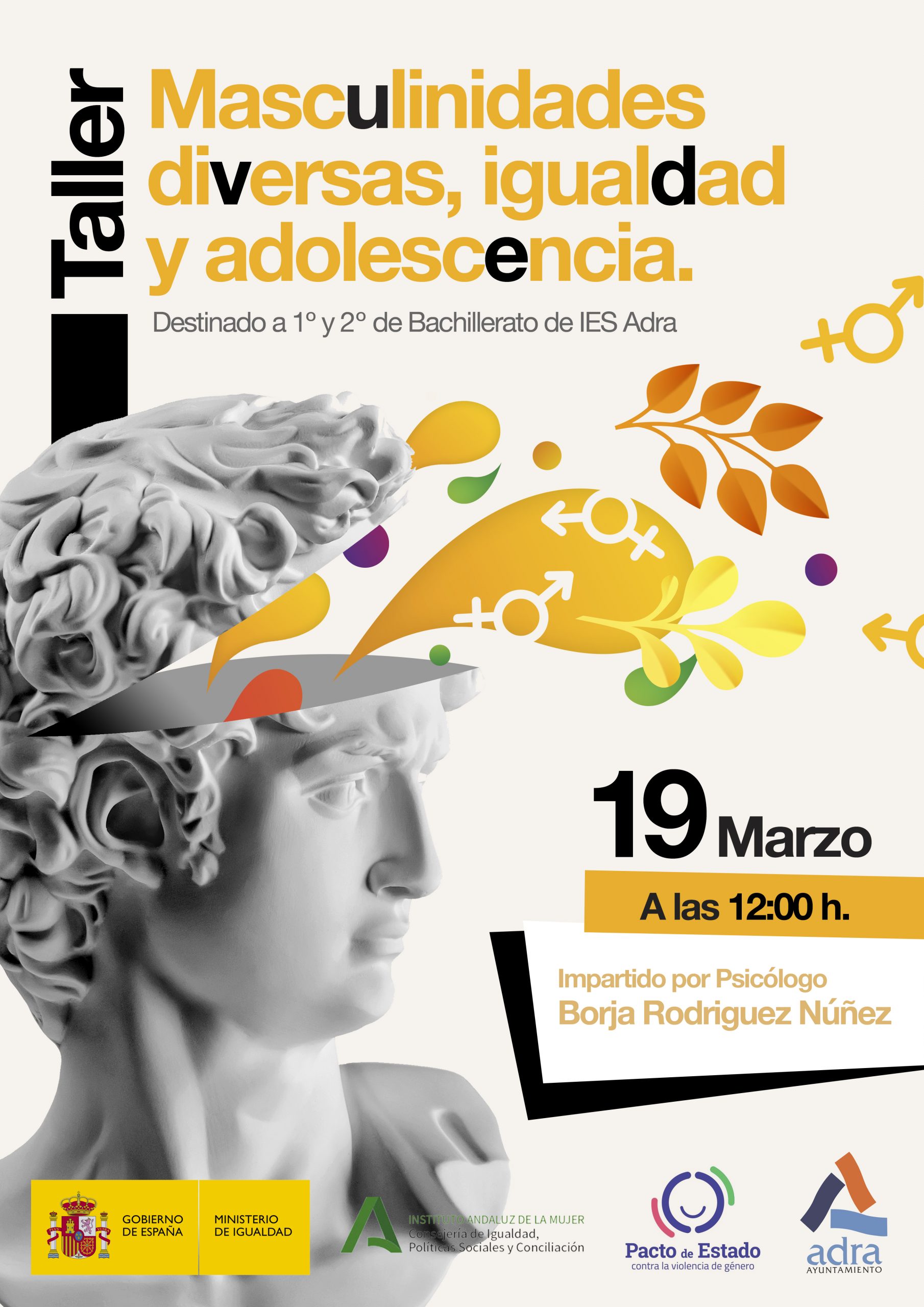 El Ayuntamiento de Adra, a través del Centro Municipal de Información a la Mujer, ofrece al alumnado de Bachiller de los IES del municipio el taller ‘Masculinidades diversas, igualdad y adolescencia’. Una actividad de prevención de violencia sexual y de género, que nace “para cubrir el hueco existente en la lucha por la igualdad entre hombres y mujeres, enfocado directamente en los hombres adolescentes”. Se celebrará el próximo viernes 19 de marzo a las 12:00 horas, de la mano del psicólogo, sexólogo y terapeuta de parejas, Borja Rodríguez Nuñez.