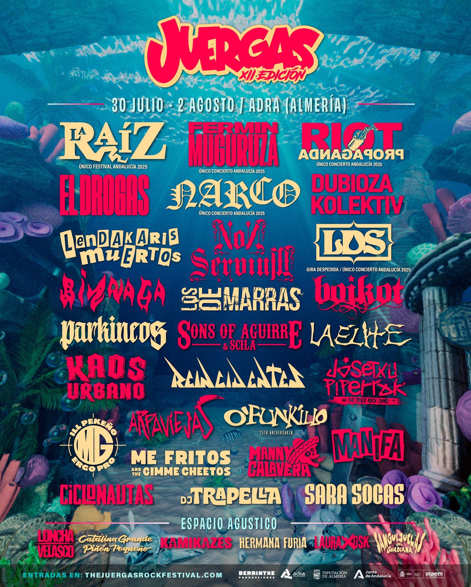 De cara a su 12° aniversario, el festival presenta una apuesta de 33 artistas que pondrán la banda sonora a la gran juerga del verano con grupos como La Raíz con su vuelta como único festival en Andalucía que se podrá disfrutar de forma única e irrepetible. Una situación similar a la del grupo Riot Propaganda con su regreso y parada única en tierras andaluzas al igual que la última confirmación del festival con la presentación de un referente histórico, Fermín Muguruza, la mítica figura del rock-punk combativo después de 11años sin girar por los escenarios.