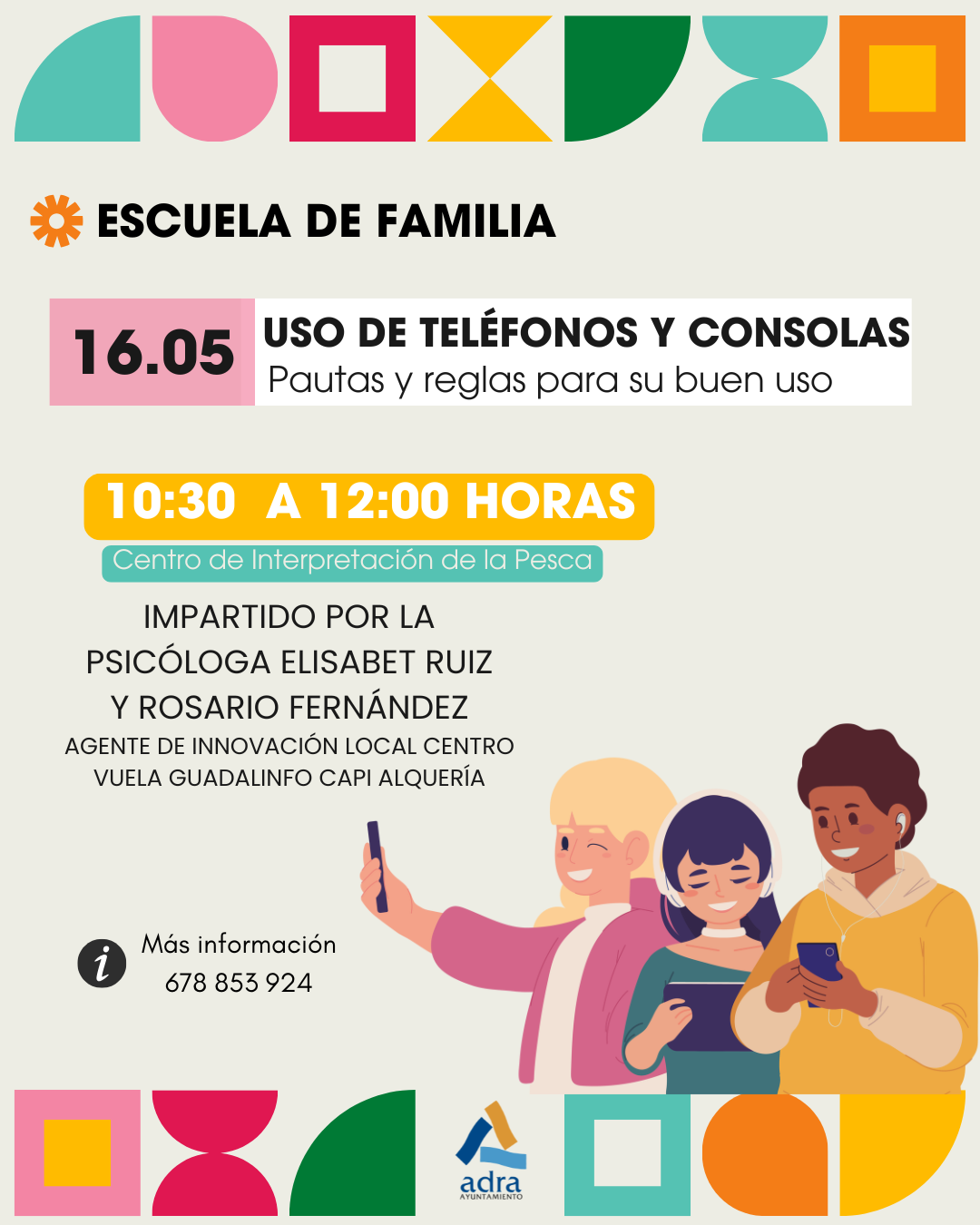 La Escuela de Familia de Adra continúa este viernes, 16 de mayo, con la charla ‘Uso de teléfonos y consolas. Pautas y reglas para su buen uso’, impartida por la psicóloga del Ayuntamiento, Elisabet Ruiz, y la agente de innovación local del Centro VUELA Guadalinfo CAPI de La Alquería, Rosario Fernández. Se celebrará en el Centro de Interpretación de la Pesca de 10:30 a 12:00 horas.