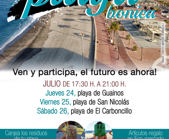 El Ayuntamiento de Adra, en colaboración con la Universidad de Almería, Objetivo Newen y el Centro de Investigación de Colecciones Científicas de la Universidad de Almería (CECOUAL) trae a la ciudad, un año más, la campaña de educación ambiental ‘Mi Playa Bonica’. Un programa de gestión integral de ecosistemas del litoral, divulgación, investigación y descontaminación de micro, meso y macro-residuos para la conservación del patrimonio natural marítimo-terrestre. Tendrá lugar el jueves, 24 de julio, en la playa de Guainos; el viernes, día 25, en la playa de San Nicolás; y el sábado 26, en la playa de El Carboncillo; todas las jornadas de 17:30 a 21:00 horas.